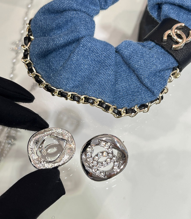 Celine silver full diamond double C hollow square earrings-3901