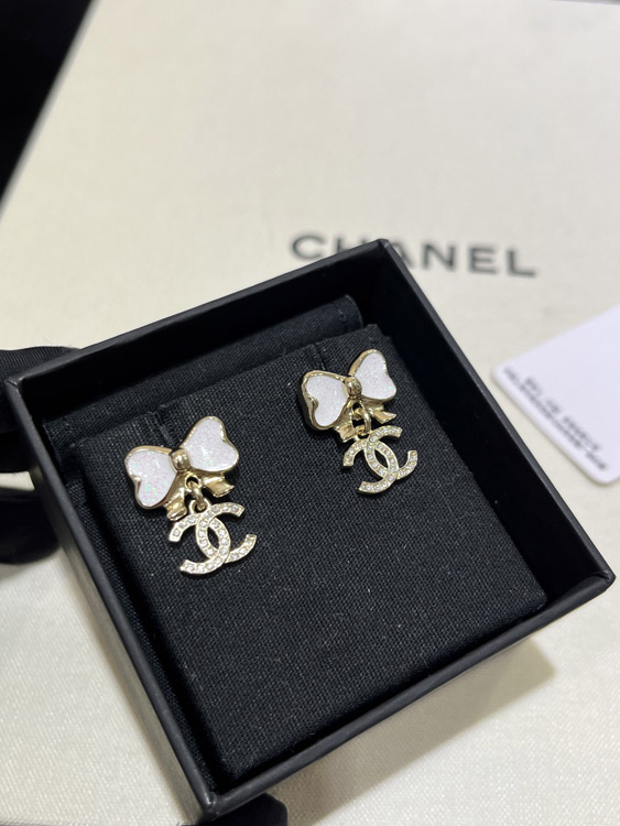 Chanel white glitter enamel bow gold full diamond double C earrings-3745