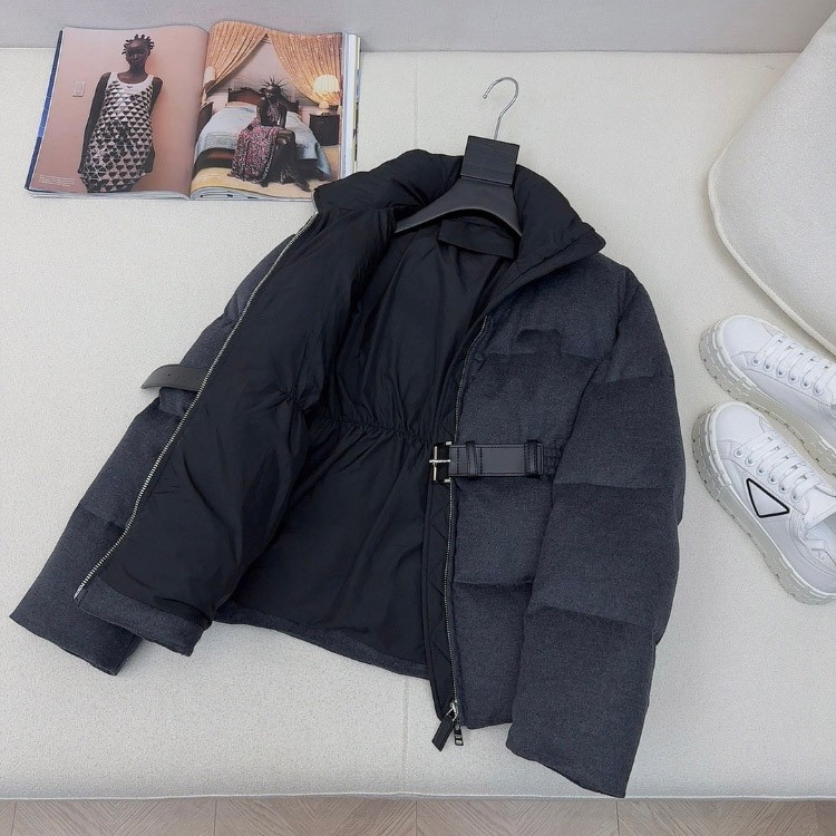 Prada stand-collar wool fabric long-sleeved belted thickened warm down jacket-5346